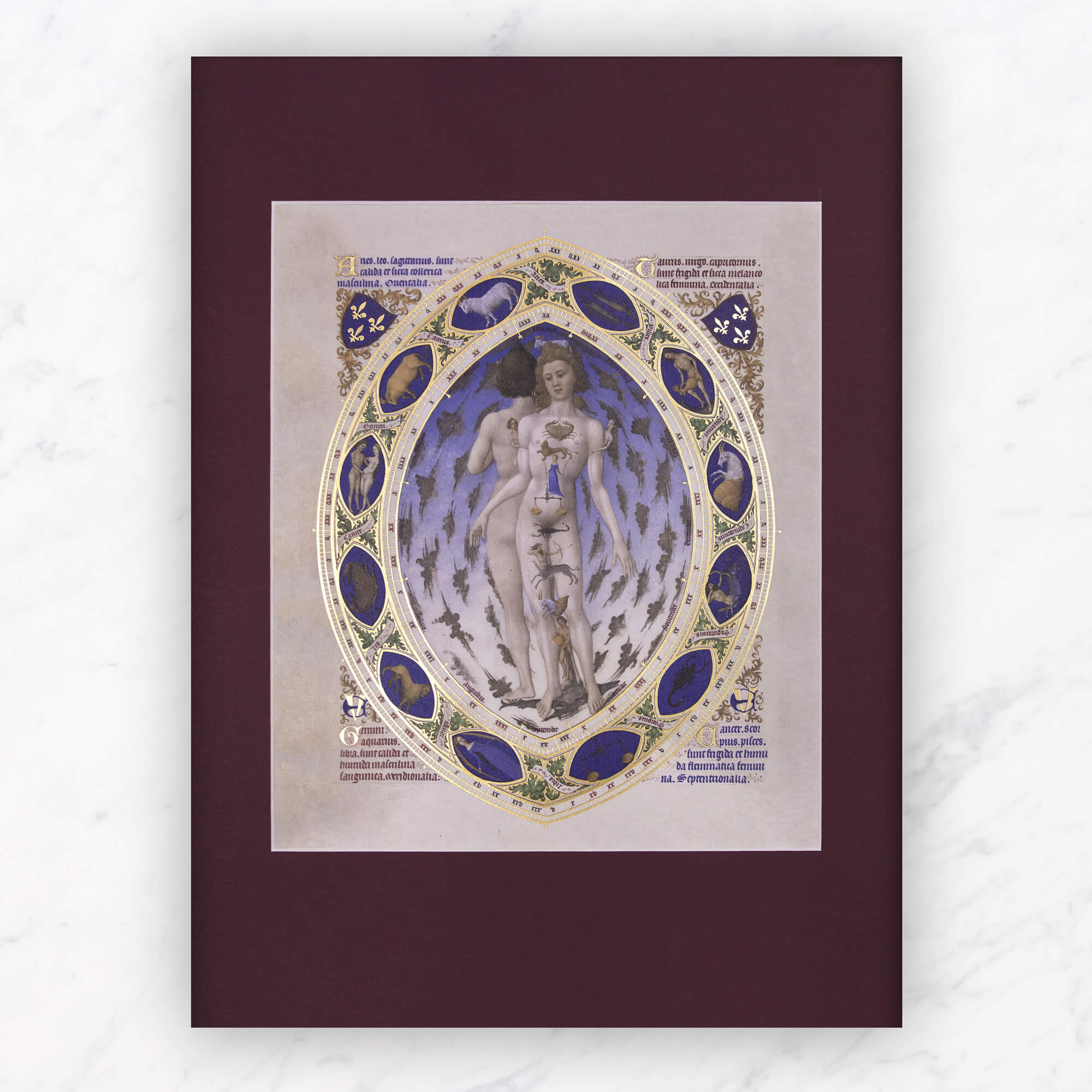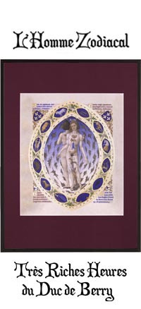 Conformément à la tradition iconographique des livres d’heures, Les Très Riches Heures du Duc de Berry s’enorgueillit d’un calendrier. A la fin de celui-ci prend place la miniature intitulée « L’Homme Zodiacal » ou « L’Homme anatomique », attribuée à l’un des frères de Limbourg, avant 1416. Elle représente un homme dédoublé et debout, de face et de dos, enchâssé dans une mandorle rehaussée du blason de Jean de Berry (trois fleurs de lys sur fond bleu), des lettres VE ou UE**, et enchâssant les signes du zodiaque. L’ensemble illustre la correspondance entre les constellations, le corps humain, les humeurs et les points cardinaux. Il est la représentation de l’homme à l’image de l’univers, comprenant dans son propre corps le macrocosme.