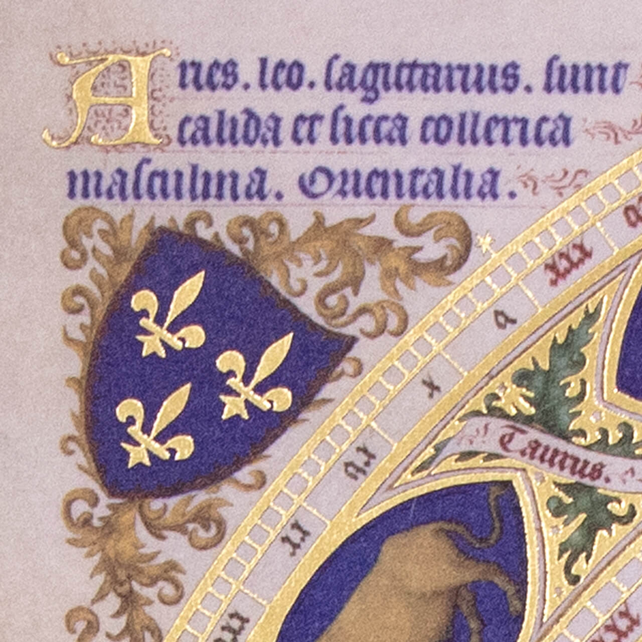 En haut à gauche est inscrit en bleu : Aries. Leo. Sagittarius. Sunt Calida et Sicca Collerica Masculina. Orientalia.