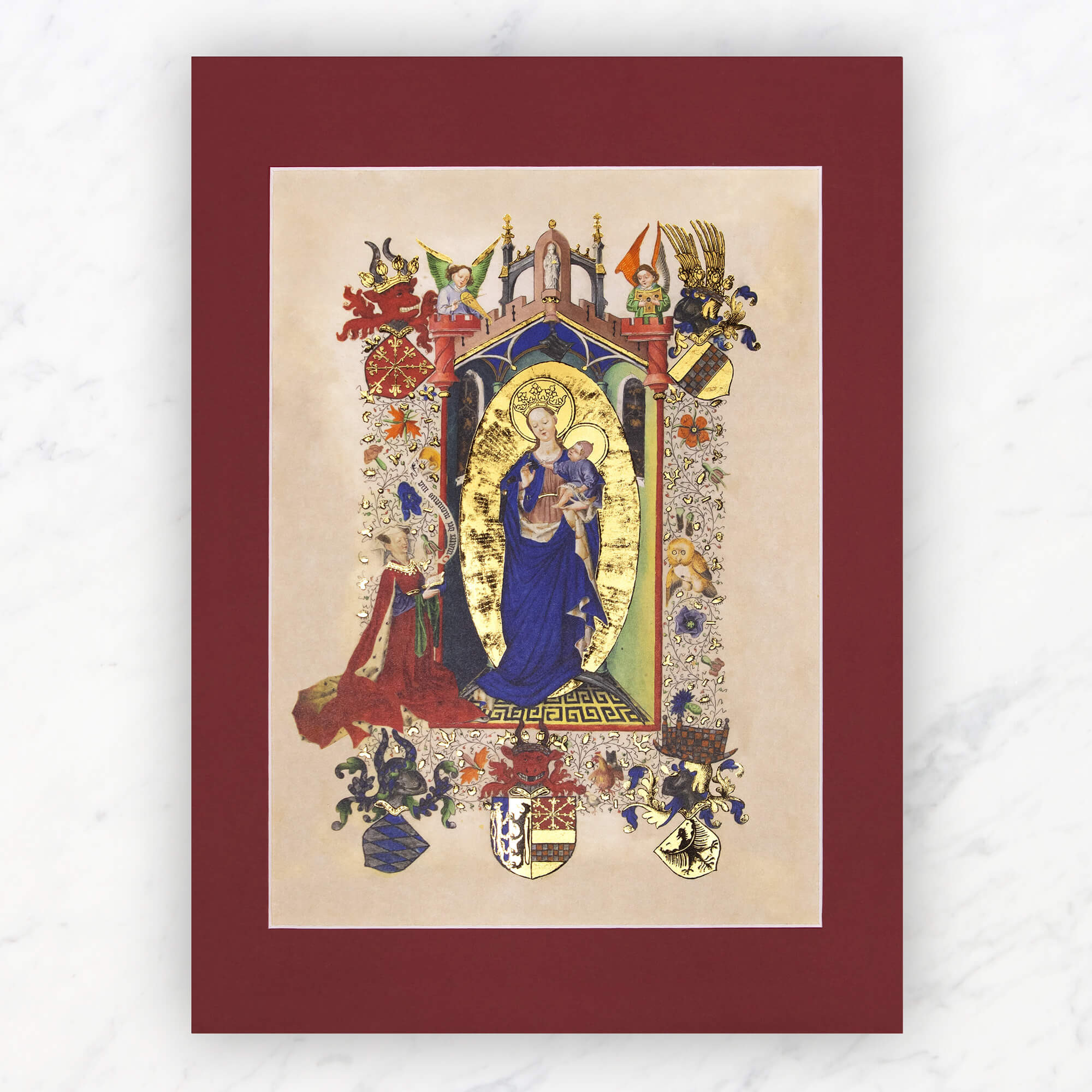 Cette miniature en pleine page inaugure le livre d’heures dit De Catherine de Clèves, dont elle demeure l’une de ses enluminures les plus éblouissantes. Elle figure la prière du matin à Notre-Dame. Catherine de Clèves y est représentée se recueillant devant une Vierge à l’Enfant, en robe rouge, son livre d’heures entre les mains. Une supplique en latin, inscrite sur une banderole, semble s’élever du livre vers la Vierge : O MATER DEI MEMENTO MEI**. Enchâssée dans l’encadrement d’un édifice gothique richement coloré, la Vierge se tient posée sur croissant de lune***, sous le regard bienveillant de deux anges musiciens. Les blasons peints dans les coins de la page et en-dessous de la Vierge sont ceux de la famille de Catherine de Clèves et de ses ancêtres. Les armes de la famille de Catherine de Clèves sont privilégiées, dans tout l’ouvrage, relativement à celles de son mari. Dans un acte de défiance, peut-être, envers le duc de Gueldre ? Dans cette page, on distingue aussi, cachés parmi les décorations florales des marges, deux dessins d’oiseaux : à droite, une chouette et un coq, dans la partie inférieure.