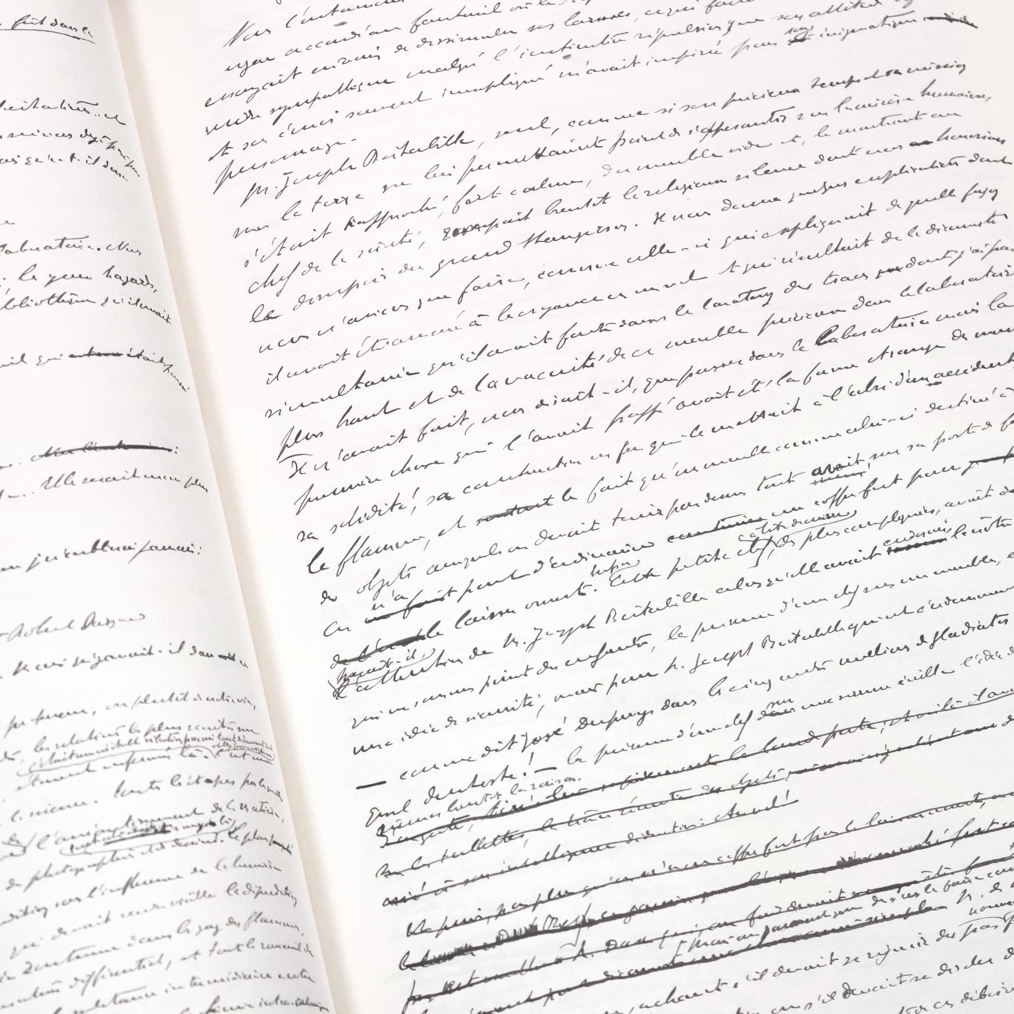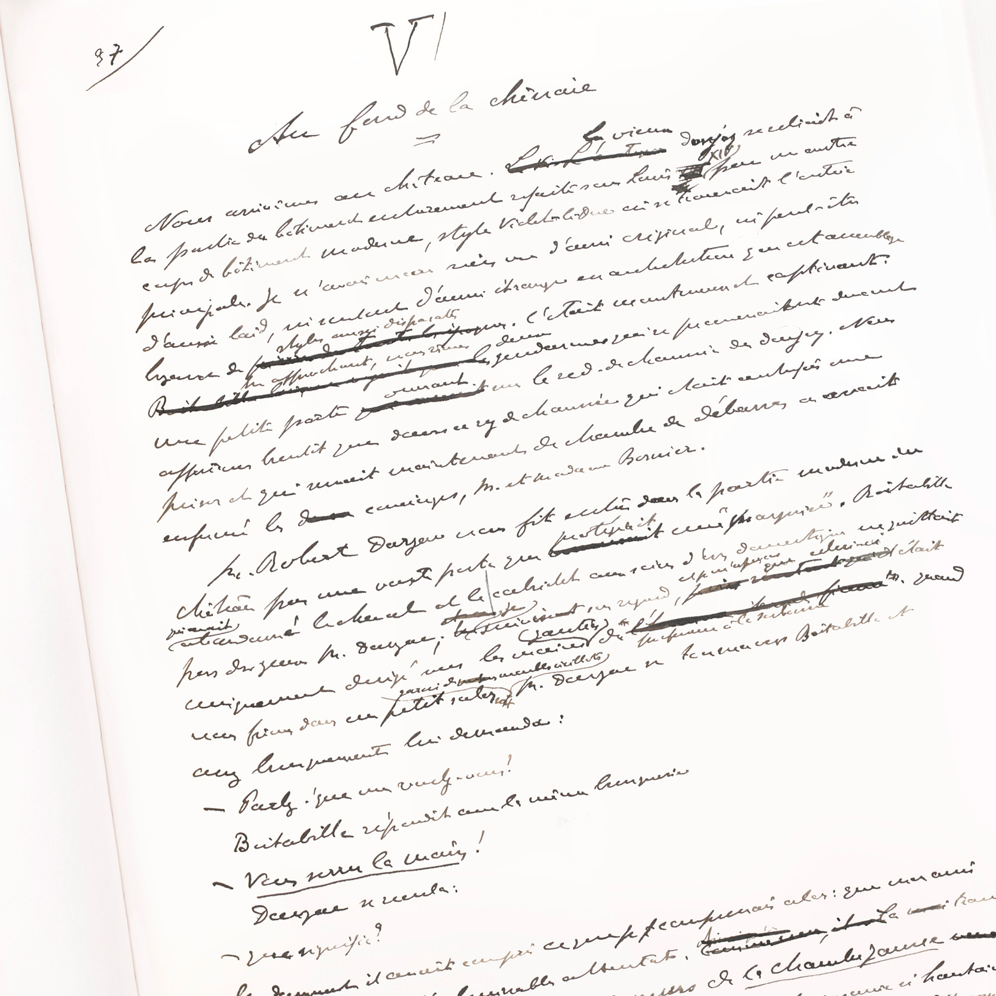 L’écriture est fine, mais souvent déchiffrable, penchée et peu caviardée, malgré le grand nombre de retouches. On notera enfin quelques coups de crayon vert et bleu – sans doute des points de repère pour l’auteur ou le dactylo ; des dialogues présentés comme au théâtre, l’initiale du prénom précédant la réplique ; un ultime chapitre, le XXIVe, intitulé « Où Joseph Boitabille apparaît dans toute sa gloire » …