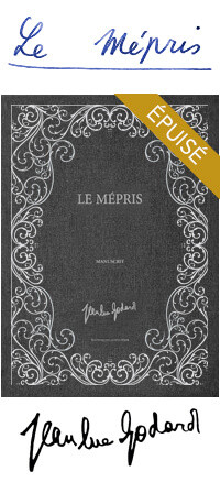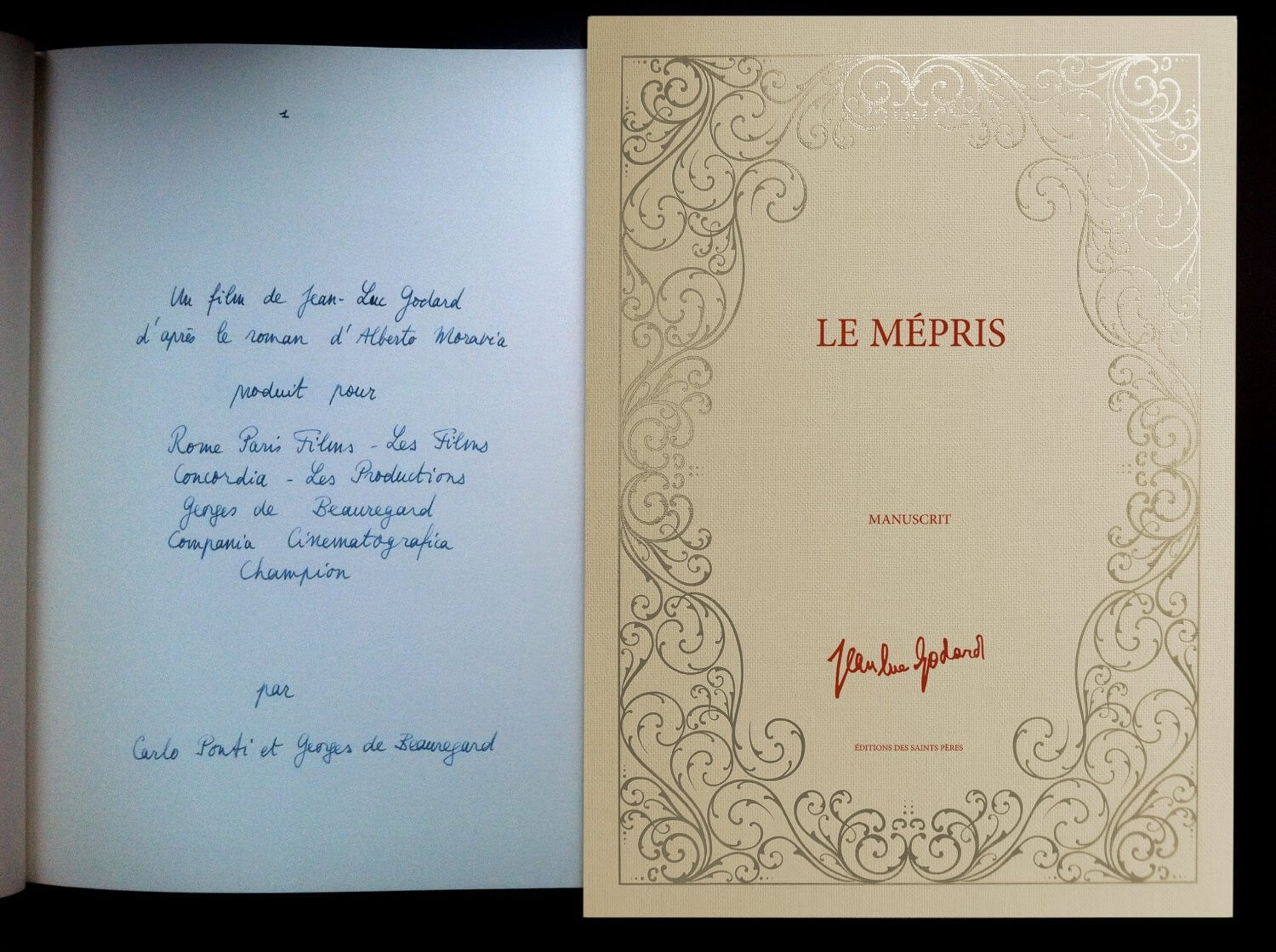 Cette édition de luxe du Mépris, scénario du film éponyme signé par Jean-Luc Godard, est composé de 149 plans, soit 59 pages manuscrites, rédigées dans une encre bleue et avec une écriture aussi élégante et régulière, additionnées de 24 feuillets tapés à la machine et corrigés de la main du cinéaste. Il s’adresse aux passionnés de cinéma ainsi qu’aux amateurs d’objets littéraires rares. Il est édité en très grand format (25 cm x 35 cm) et en série limitée. Chaque exemplaire est numéroté à la main de 1 à 1000.
